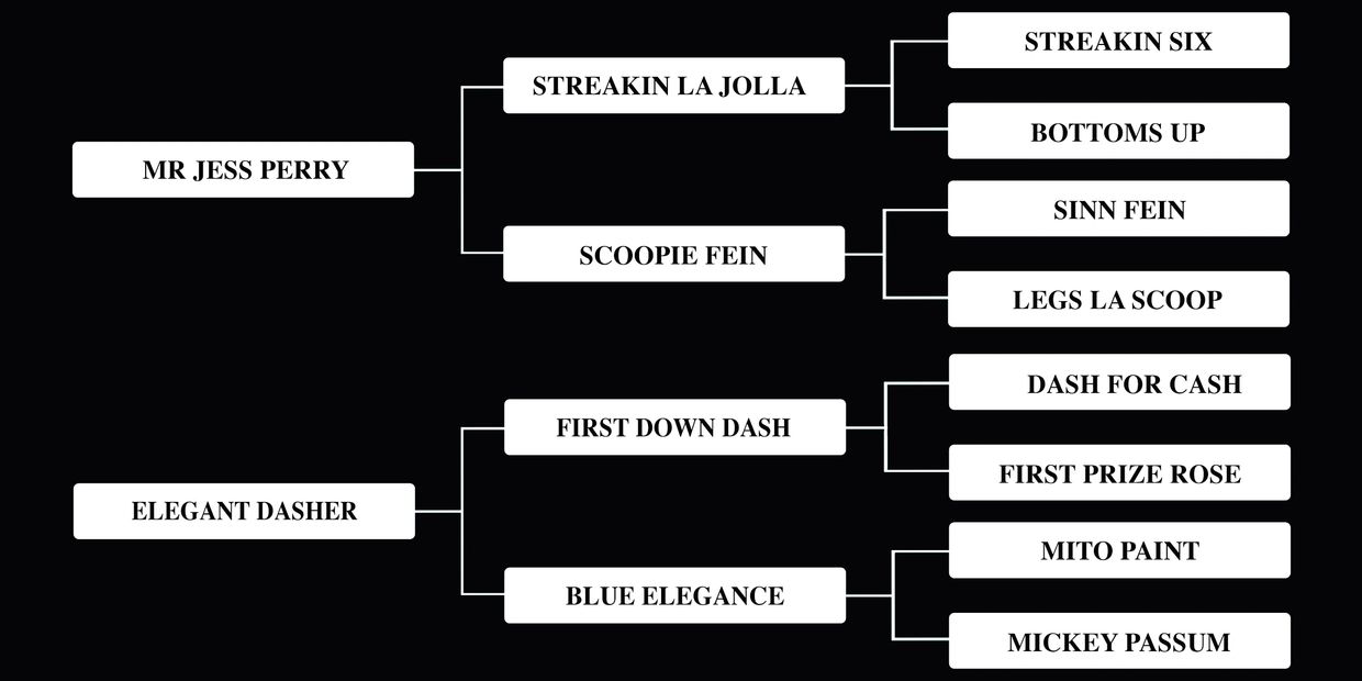1st Dam Elegant Dasher: SI 111, LTE $115,879. Set two track records in 1996 and 1997. Stakes Placed Producer; Progeny earnings of +$273,696; Blue Elegance; progeny earnings