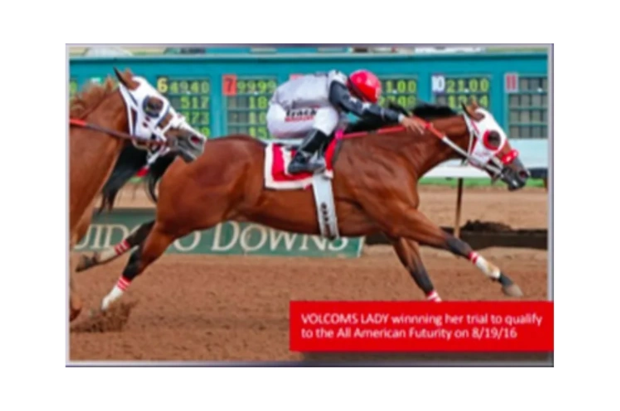 Volcoms Lady's dam, Lethal Cash, had a speed index of 123 earning $52,865 and producing progeny with earnings of over $295K. She was sired by Takin On The Cash, who had a speed index of 109 earning $661,747. He was sired by Dash For Cash (SI-114 LTE $507,689 PE $39.9+ million) out of Take You On (SI-96 LTE $153,379 PE $832K). Lethal Cash's dam, Lethal Coup, had a speed index of 99 earning $4,579. She was sired by Coup De Kas (LTE $88,220 PE $5.1+ million) and out of Lethal Weapon (LTE $790 PE $450K+).